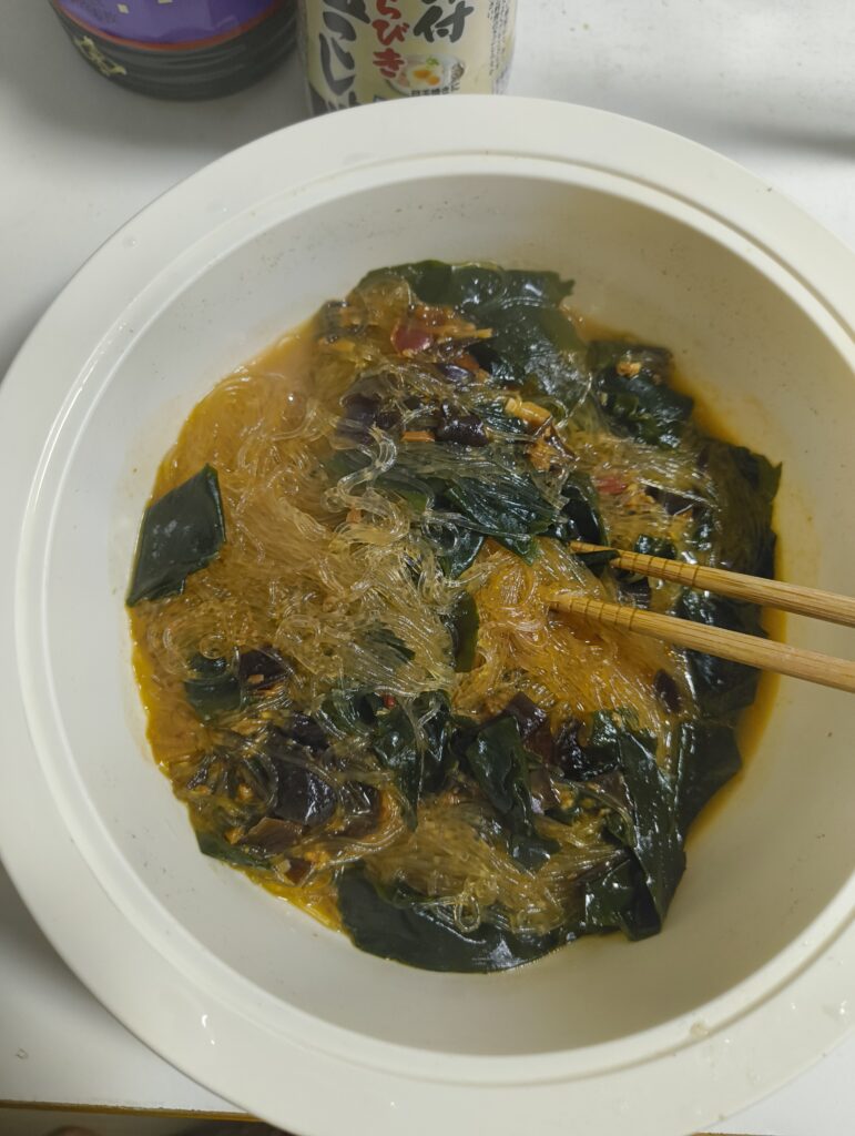 ↑乾燥わかめが大量に余っていたので、春雨と一緒に茹でて食べた。うまいのに写真に撮ると見た目が悪いような気がするな。