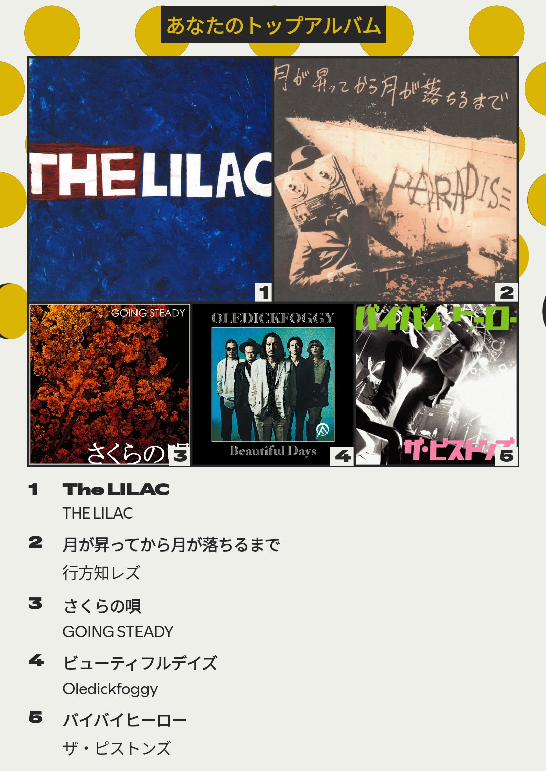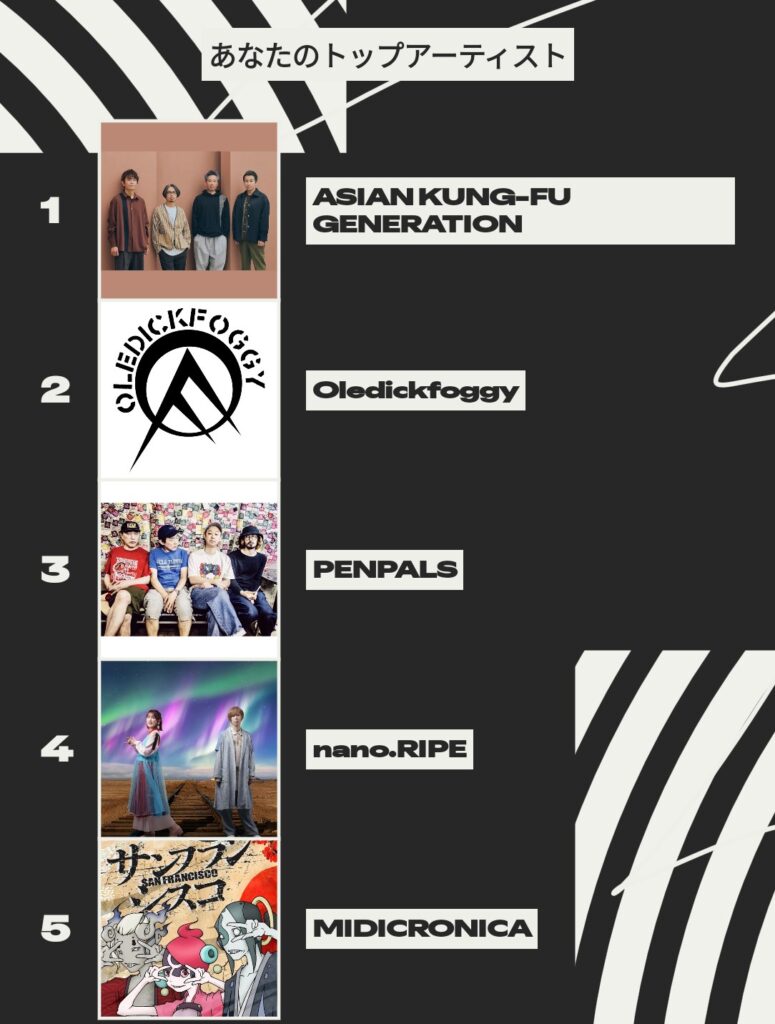 ↑よく聴いたアーティスト。PENPALSはこれまで配信されていなかった曲が今年から配信されたのでよく聴いていたよ。