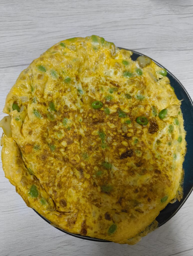 今回のオムレツは中身に冷蔵庫の在庫をアレやコレやとぶち込んでおり、かなり重量があったため、上手くいくか不安だったのだが、しっかりと空中で回転させることができた。