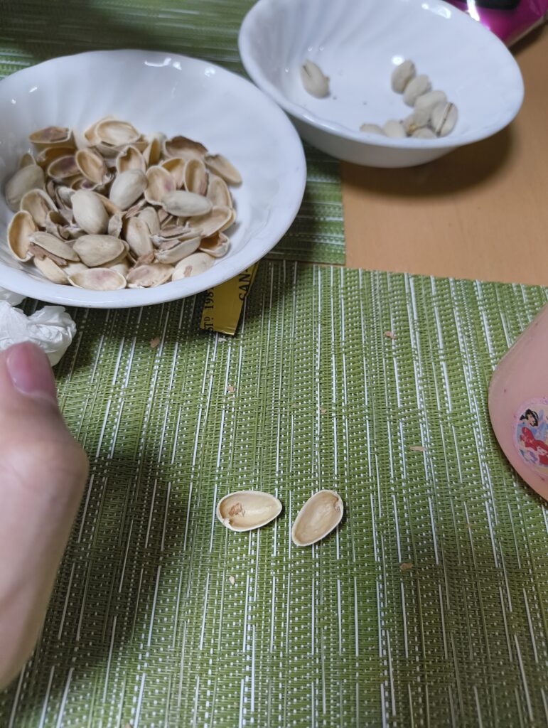 ↑妹が父の顔をピスタチオの殻に描いていた。器用なもんだよ。