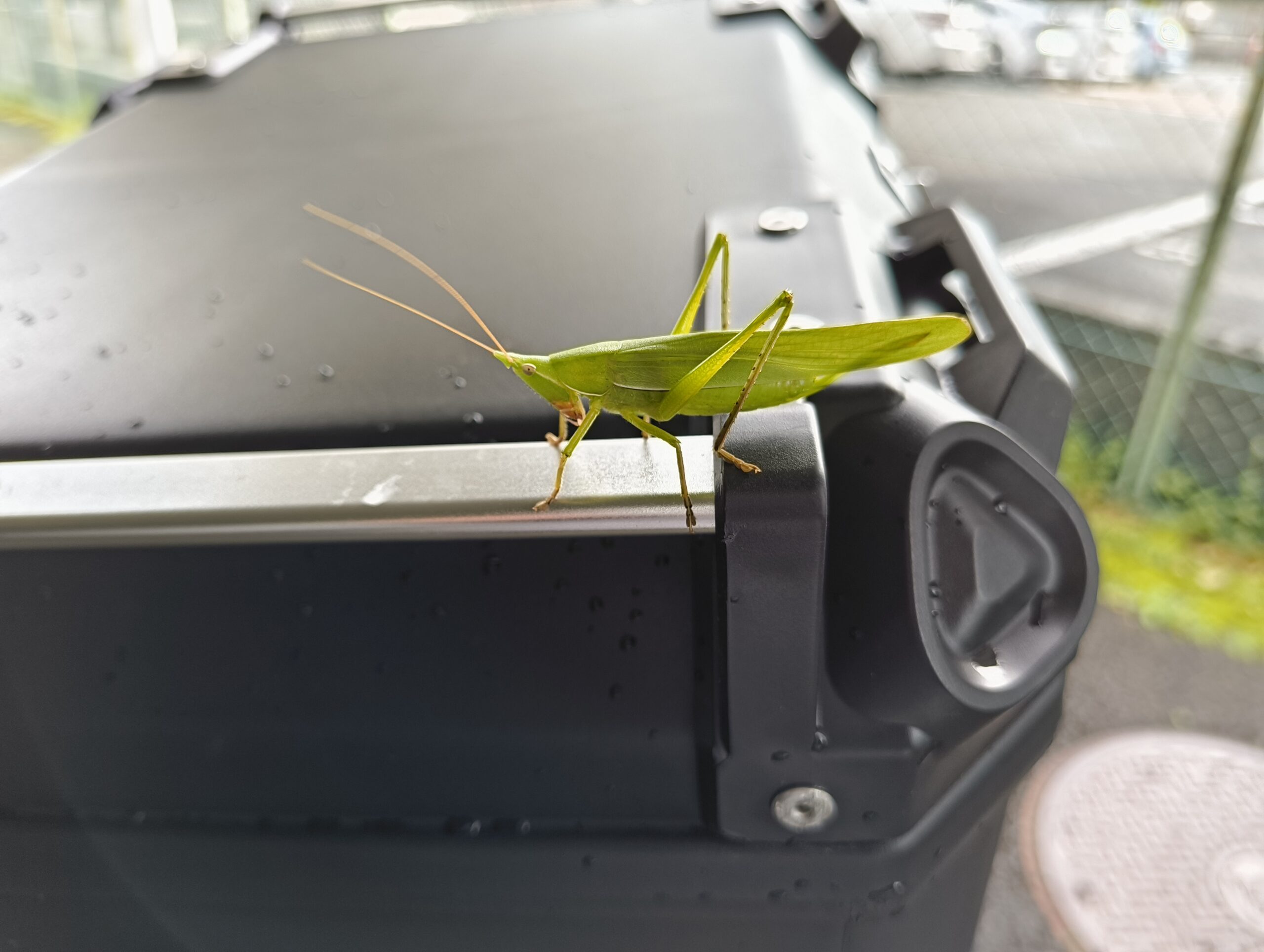 ↑バイクに乗って出かけるとバッタがくっついていた。