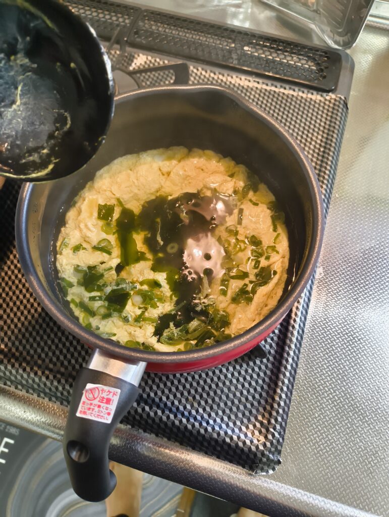 そんで、そのわかめの緑色がたまごに移って妙な色合いに。