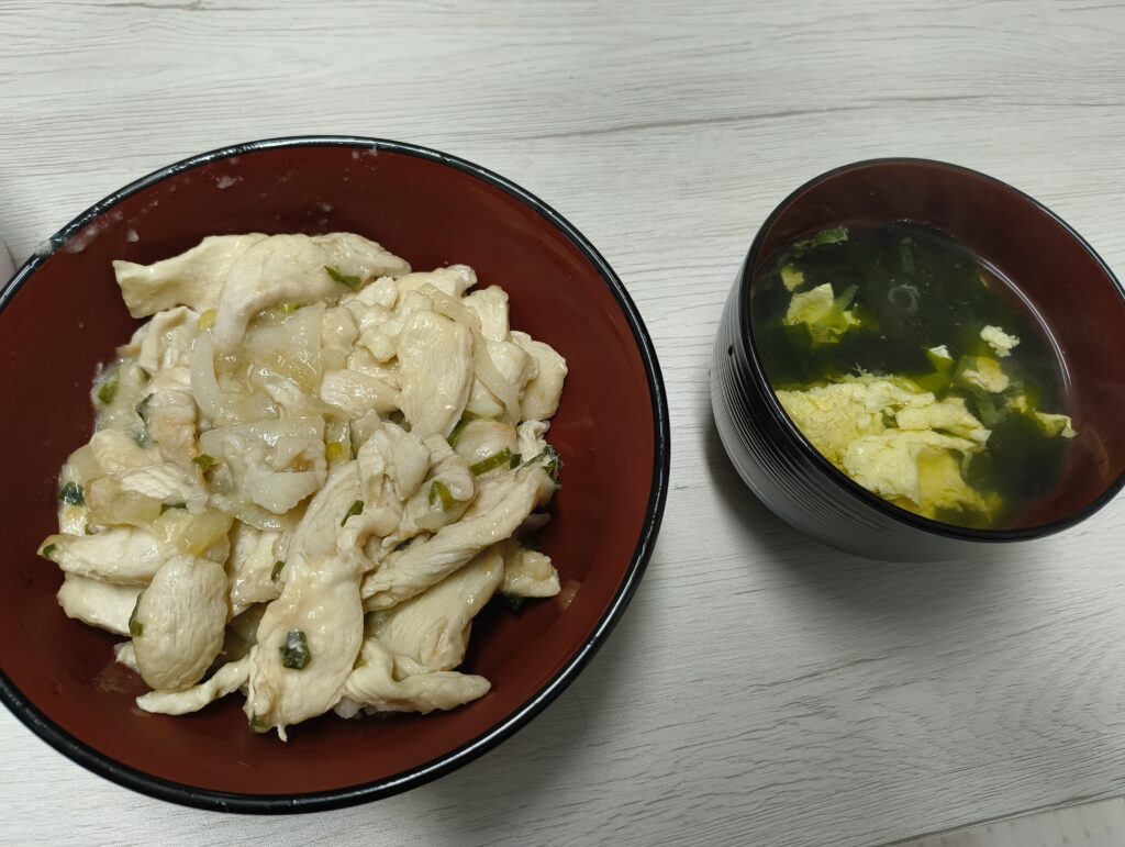 ↑夕食。鶏胸肉に片栗粉をまぶして炒めたものとたまごスープ。